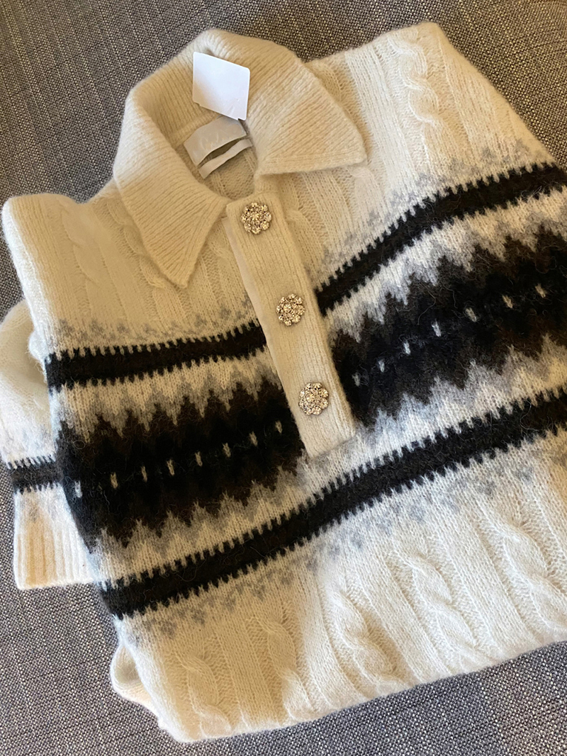 Avec boutons décoratifs ornés de "cristaux" . Silhouette ample décontractée Manches 3/4 carrées Style de pull Col avec bouton avec maille ample du meilleur effet. Répétition du motif au niveau des manches !